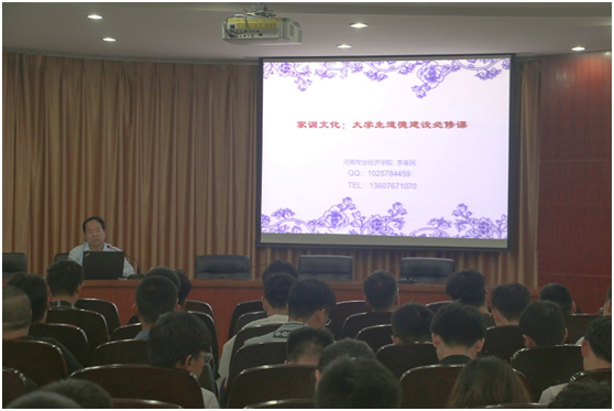 学习优秀家训文化,助力大学生思想道德建设。5月9日晚,我院人文道德大讲堂本学期首场讲座开讲。河南牧业经济学院旅游管理系党总支书记李喜民教授应邀,为学院190余名师生作了题为“家训文化—大学生道德建设必修课”的专题讲座。宣传部负责人和工作人员也听取了讲座。听讲师生共同学习家训文化,接受中华传统文化洗礼。