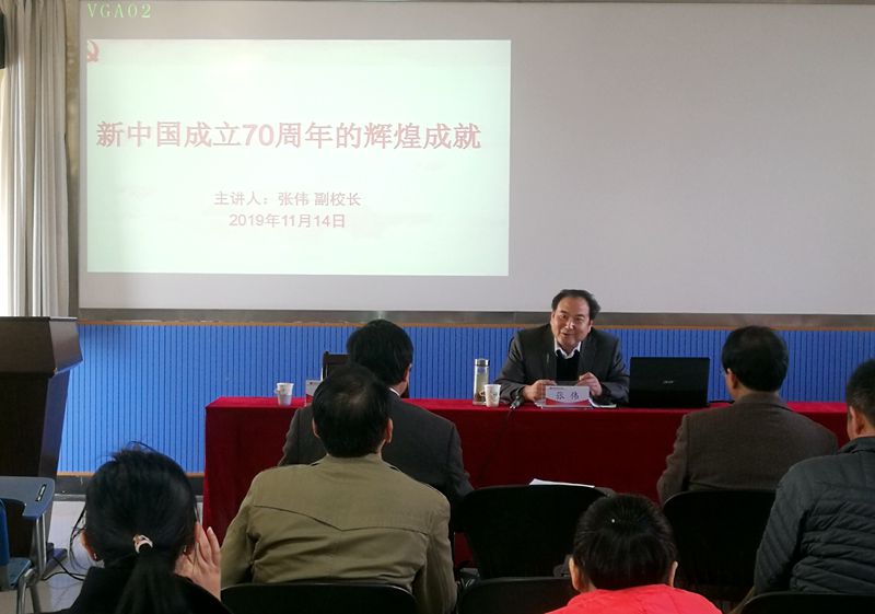 张伟副校长首先引用习近平总书记在庆祝中华人民共和国成立70周年大会上的讲话,指出70年来,全国各族人民同心同德、艰苦奋斗,取得了令世界刮目相看的伟大成就。今天,社会主义中国巍然屹立在世界东方,没有任何力量能够撼动我们伟大祖国的地位,没有任何力量能够阻挡中国人民和中华民族的前进步伐。”随后,张校长从“新中国70年辉煌成就,波澜壮阔、彪炳史册的70年,怎么认识新中国70年辉煌成就”等三个方面,给大家上了一堂精彩的党课。张校长指出,70年来,一切奇迹都是奋斗的结果。70年的历史证明,必须要坚持党的全面领导,必须要坚持和发展马克思主义。必须要坚持改革开放,必须要牢牢掌握意识形态工作领导权。